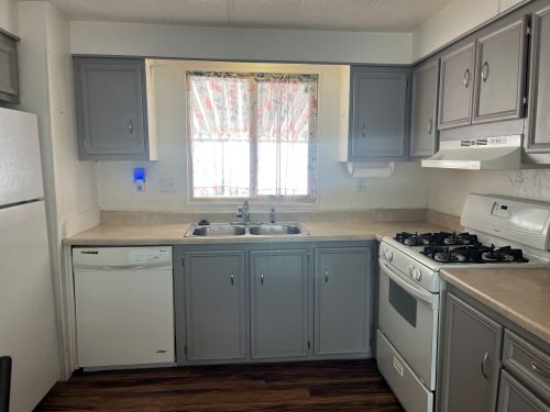 Updated kitchen with gray cabinets, white appliances & a gas range